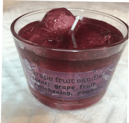 This is a home made candle it is scented grape fruit. This candle is enrichening and powerfull shop for your candle now!!