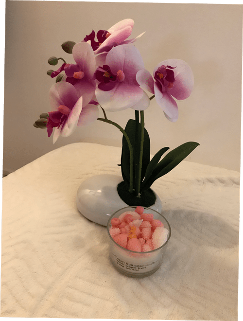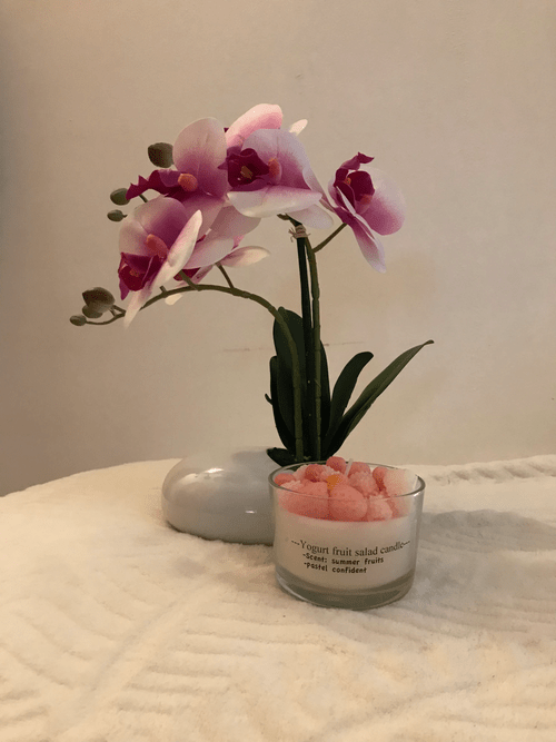 This is a pastel pink fruit salad candle, it's lovely fruit scented, it has a white layer of soy wax and them some little pastel pink fruits, this is a very unique candle hope you guys like it ! Get your candle now !!